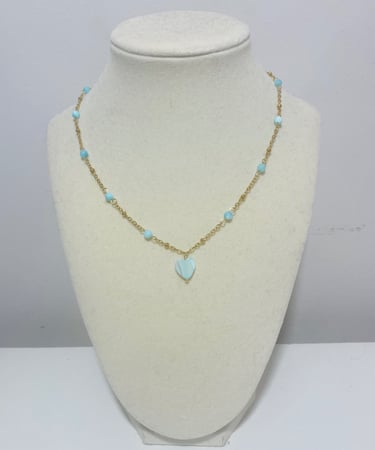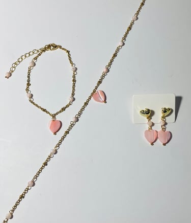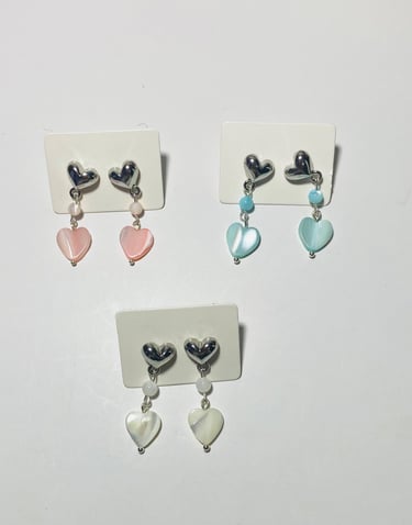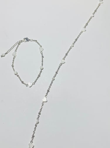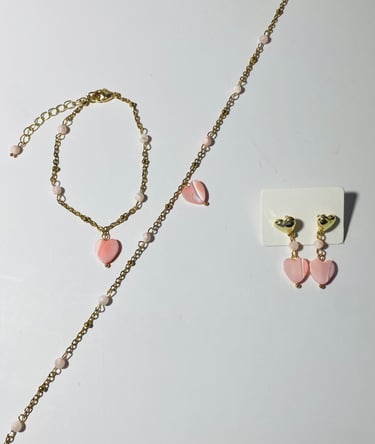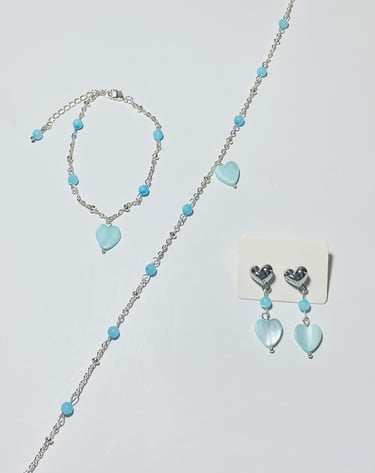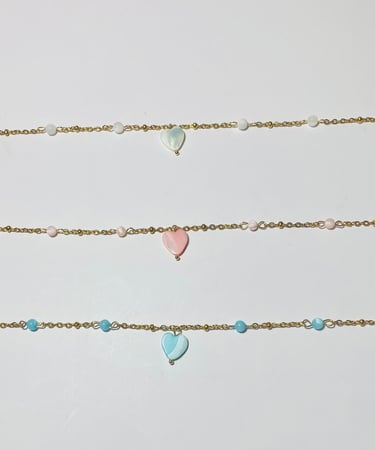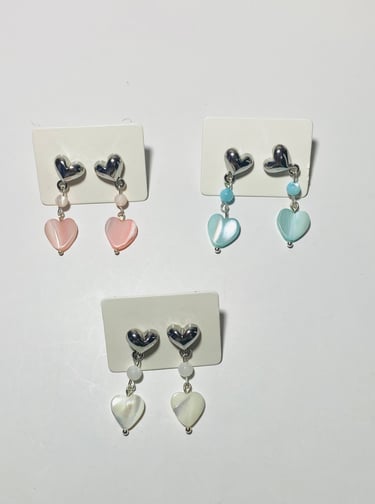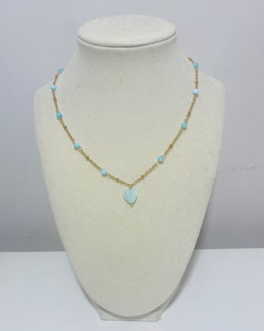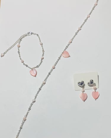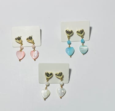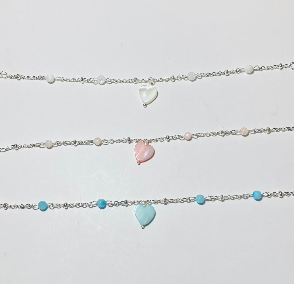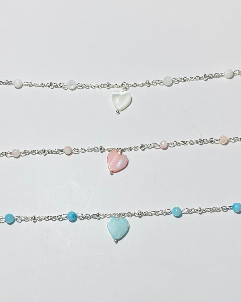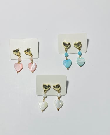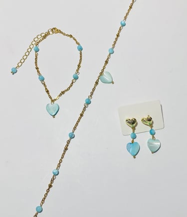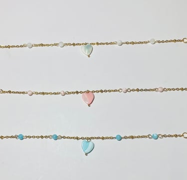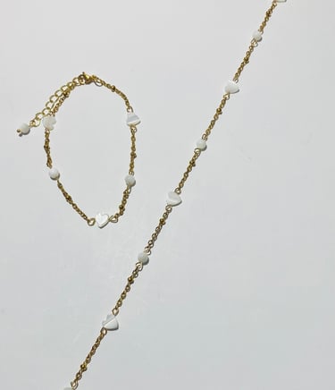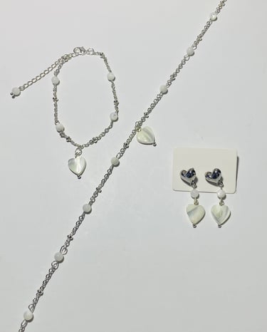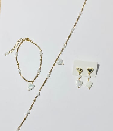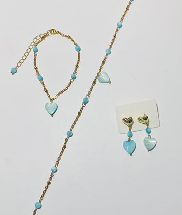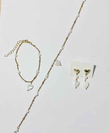 Beaded 18k gold plated and silver plated Mother of Pearl jewelry. Shop matching bracelet, necklace, and earring sets. Available in mini white hearts, white hearts, pink hearts, and aqua hearts.